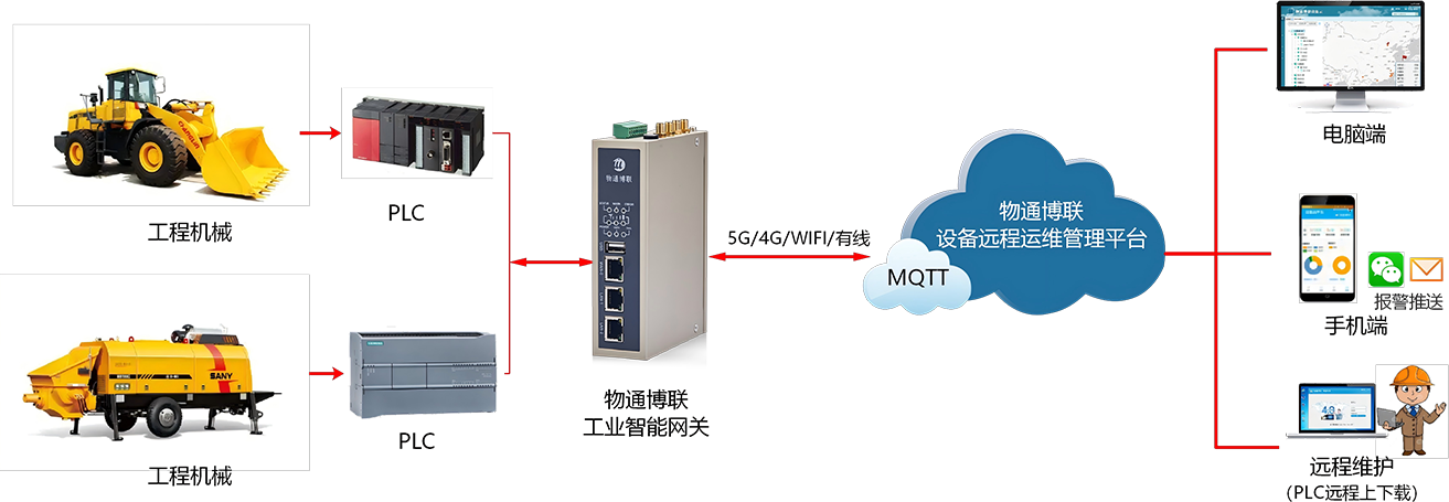 通過物通博聯的工業智能網關,連接工程機械設備的控制器、傳感器等設備,實時采集設備的位置信息、運行狀態(如工作、空閑、故障等)、運行參數(如發動機轉速、油壓、水溫等)、油耗等數據。將采集到的數據傳輸至設備運維管理平臺,平臺對數據進行分析和處理。當設備出現故障時,及時發出預警,并通過物通博聯設備維護快線進行遠程維護,提高維護效率,降低運維成本,實現設備全生命周期數字化管理。