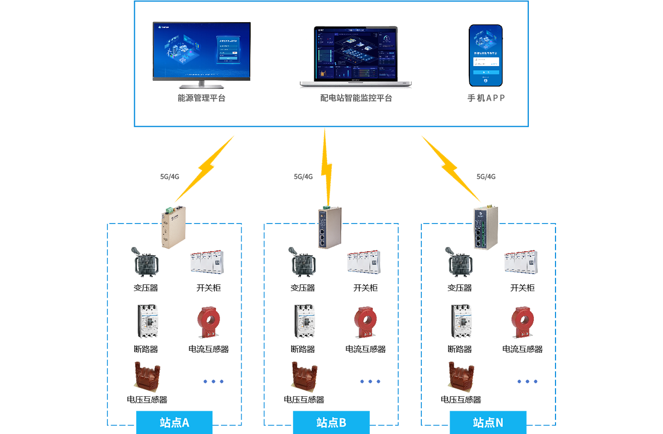 通過物通博聯的能源電力網關采集配電站的各類設備(如變壓器、開關柜、斷路器等)將采集到的配電數據(如電流、電壓、溫度、濕度等)傳輸至配電站智能監控平臺。平臺實時監測設備狀態,當出現異常或故障時及時發出預警,并提供故障診斷和處理指導。同時具備電能質量監測功能,支持遠程運維操作和負荷優化管理。