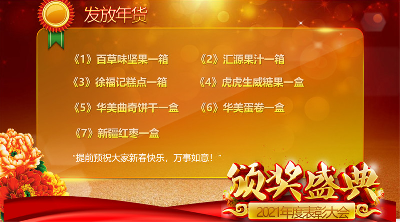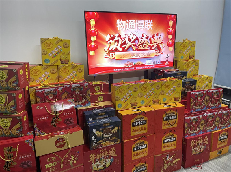 2、物通博聯為每個員工準備了豐盛的年貨和晚宴,每個人人均10箱的年貨。