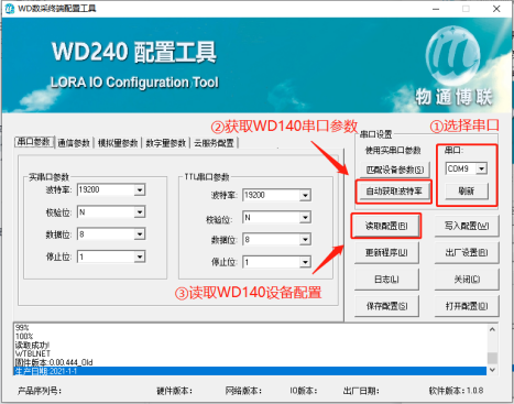 打開(kāi)配置工具,選擇相應(yīng)的串口,點(diǎn)擊“自動(dòng)獲取波特率”,獲取成功后點(diǎn)擊“讀取配置”。