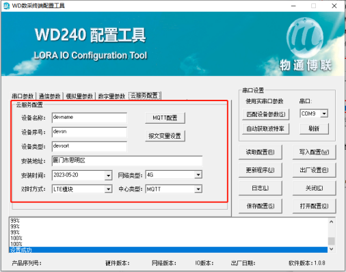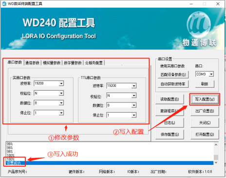 可以通過(guò)配置工具修改WD140設(shè)備的串口參數(shù)以及通訊參數(shù)(相關(guān)配置的說(shuō)明請(qǐng)繼續(xù)閱讀此文檔),修改完成后點(diǎn)擊“寫(xiě)入配置”,等待下方提示寫(xiě)入成功后即可。
