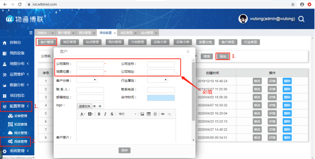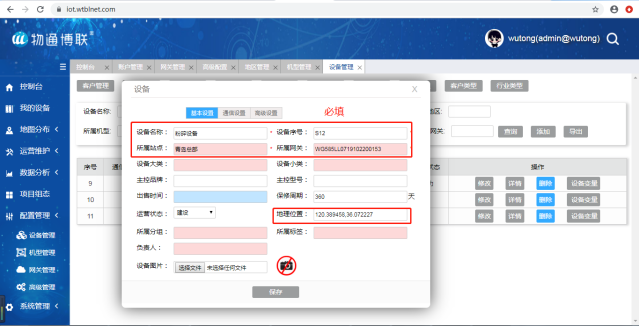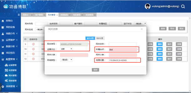 在云平臺的網關管理中添加新網關的信息,必填項為:網關系列號(大寫) 、網關所屬站點和運營狀態,其余為選填項。