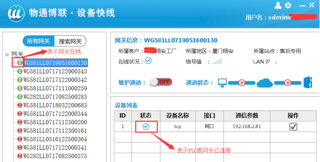 點擊建立通道,如果該網關沒有其他維護工程師在維護,就會建立起通道,通道建立后,就可以使用PLC編程軟件或者其他組態軟件對遠程操作設備。