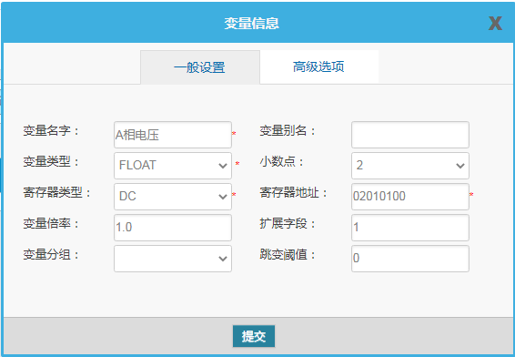 變量配置主要是定義變量名(自定義內(nèi)容,不可使用中文命名)、變量別名(自定義,可使用中文名字)、寄存器類型和寄存器偏移地址(請查閱對應(yīng)支持的數(shù)據(jù)標(biāo)識),并定義一些數(shù)據(jù)規(guī)則(如:倍率、小數(shù)點、單位、告警)