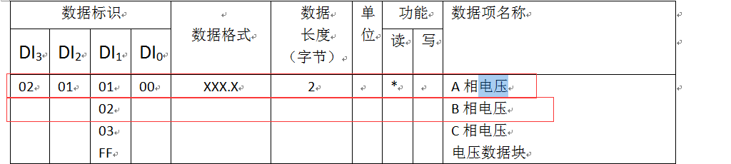寄存器地址:查表獲取,比如DL/T645-07協(xié)議的A相電壓,查表對應(yīng)的數(shù)據(jù)標(biāo)識是02010100,B相電表對應(yīng)02010200。