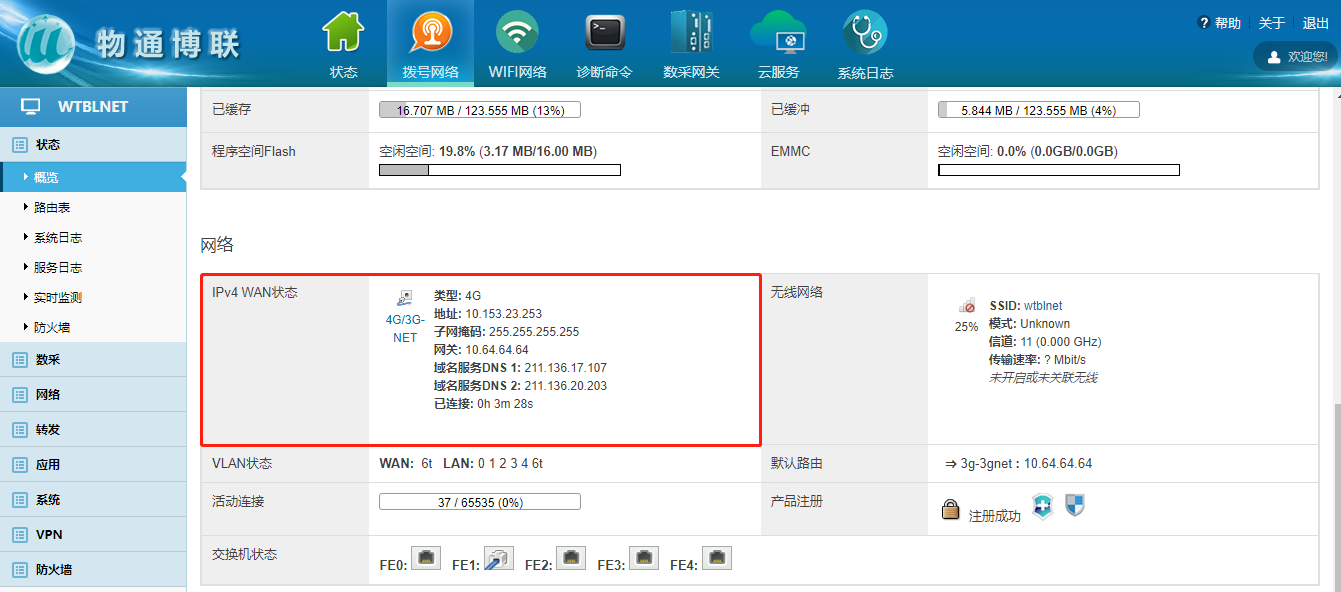 通常支持5G/4G/3G上網的網絡隔離器的出廠配置是5G/4G/3G流量卡上網的模式,使用上電前將流量卡、天線(5G/4G/3G天線延長線的SMA頭是針,網絡隔離器上的連接頭是孔)裝上就可以了。也可以進入網絡隔離器的WEB界面,查看5G/4G/3G信號值以及5G/4G/3G網絡聯網情況,如下圖: