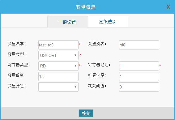 變量配置主要是定義變量名(自定義內(nèi)容,不可使用中文命名)、變量別名(自定義,可使用中文名字)、寄存器類型和寄存器偏移地址,并定義一些數(shù)據(jù)規(guī)則(如:倍率、小數(shù)點(diǎn)、單位、告警)。