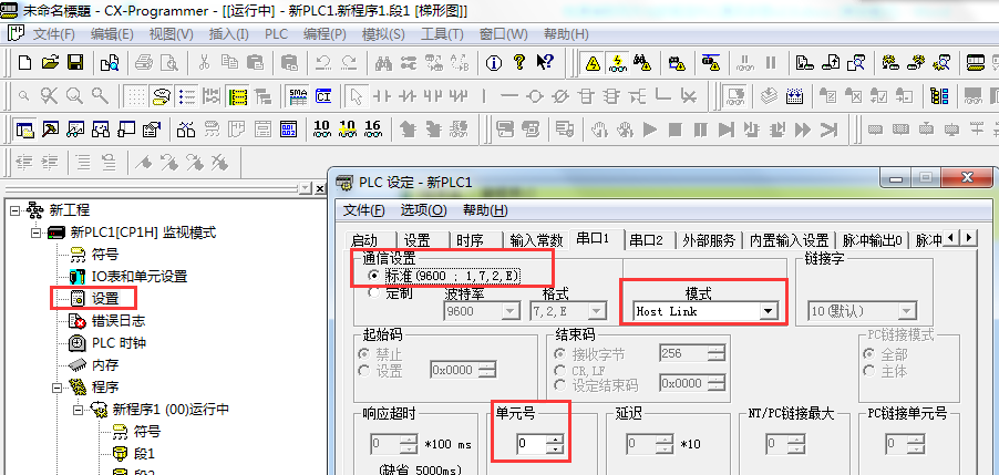 電腦與CH1P通過編程線直連后,啟動CX-P,打開菜單欄中的PLC---自動在線---USB連接,連接成功后,打開設置,設置串口參數(單元號、波特率、數據位、停止位、奇偶校驗、通信模式),如下圖所示: