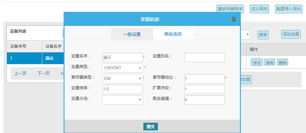 變量配置主要是定義變量名(自定義內容,不可使用中文命名)、變量別名(自定義,可使用中文名字)、寄存器類型和寄存器偏移地址,并定義一些數據規則(如:倍率、小數點、單位、告警)。