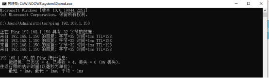 1、將PLC與網關通過LAN口相連接,通過設備快線(維護通道搭建成功后)在遠程電腦上使用cmdpingPLC的IP地址(192.168.1.150為PLC的IP地址)