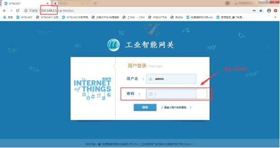 打開瀏覽器輸入網(wǎng)關(guān)地址192.168.2.1,登錄密碼默認(rèn)為123456(如有修改請按實(shí)際填寫)