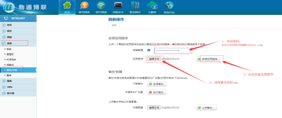 進(jìn)入系統(tǒng)→備份升級,輸入升級密碼:wtbl1234567890@WideIOT.com ,然后選擇對應(yīng)要升級的ipk,最后點(diǎn)擊安裝,進(jìn)度條顯示100%即完成操作。