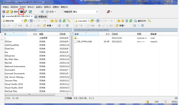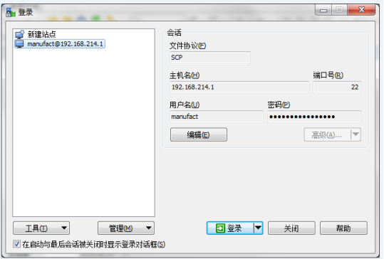 第二步:打開WinSCP軟件,將文件協議配置為SCP,主機IP:192.168.214.1 端口號:22,用戶名manufact,密碼大寫:SUNRISE。