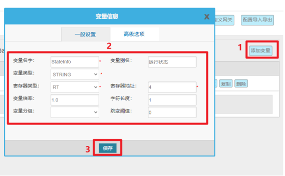 變量配置主要是定義變量名(自定義內容,不可使用中文命名)、變量別名(自定義,可使用中文名字)、寄存器類型和寄存器偏移地址,并定義一些數據規則(如:倍率、小數點、單位、告警)。