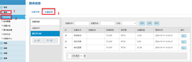 數采配置(設備信息+變量參數)完成后,重啟采集程序并生效配置即可在:數采信息---變量數據---設備名稱 中看到采集上來的數據。