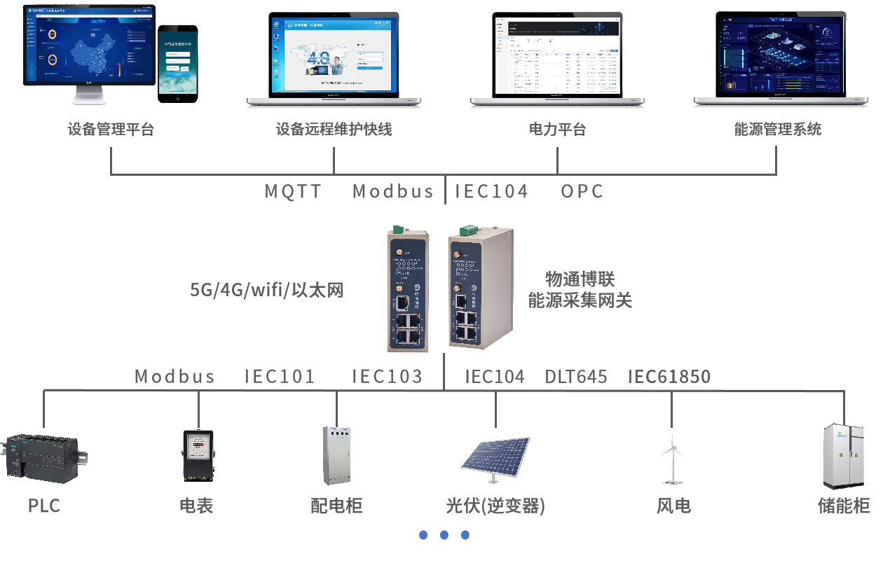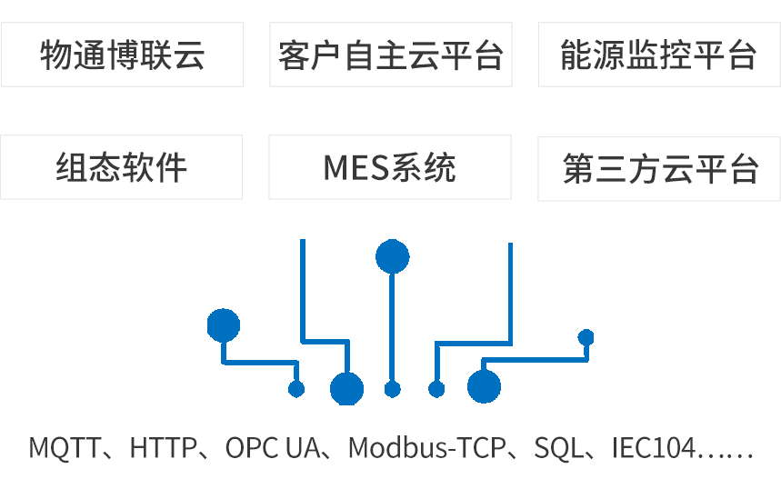 北向支持接入物通博聯(lián)云平臺(tái),客戶自主開發(fā)的云平臺(tái),第三方云平臺(tái)(根云、美云、華為、阿里、百度、微軟等IOT云平臺(tái)),能源監(jiān)控平臺(tái)等