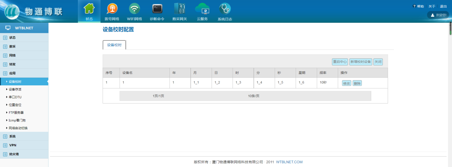 點擊“開啟”按鈕(注意:當該設備校時功能處于關閉狀態時,該按鈕顯示開啟,反之顯示關閉);點擊“重啟中心”按鈕,等待提示成功,使配置生效。