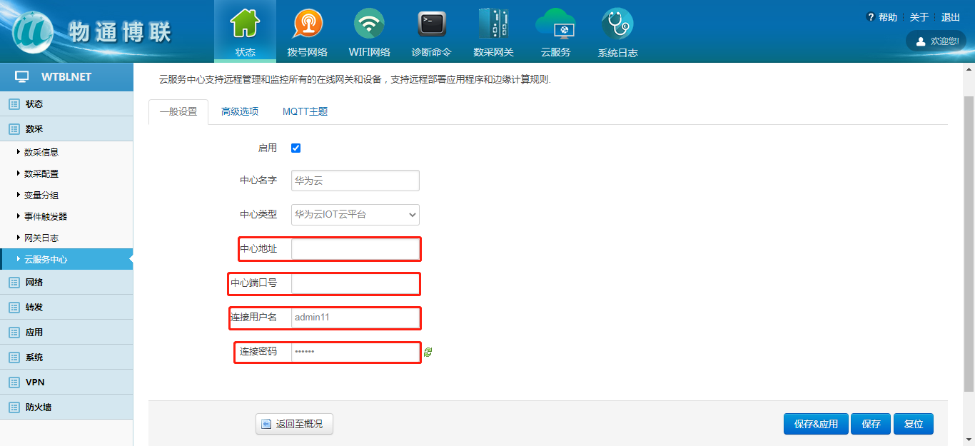 工業(yè)網關配置界面,填寫相關連接參數(shù),配置內容,即可將數(shù)據(jù)上傳至華為云IOT設備接入模型中(每種不同的第三方接入云,都有詳細的配置手冊)