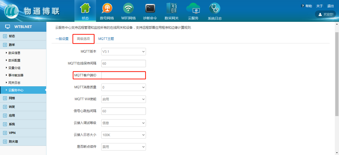 在高級選項中配置MQTT客戶端ID連接參數(shù),填寫完畢后保存并應用;