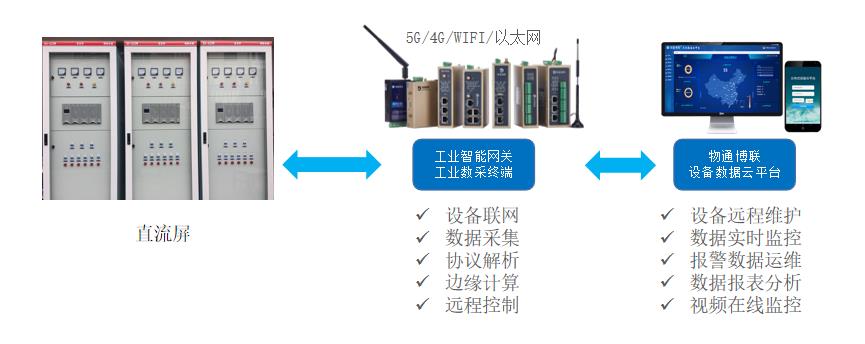 為解決直流屏使用中的痛點(diǎn)和難點(diǎn),物通博聯(lián)推出基于工業(yè)智能網(wǎng)關(guān)的直流電源屏遠(yuǎn)程監(jiān)控預(yù)警系統(tǒng)解決方案。通常直流屏配有標(biāo)準(zhǔn)RS232/485串行接口和以太網(wǎng)接口,通過這些接口網(wǎng)關(guān)可以實(shí)時(shí)采集運(yùn)行參數(shù)并實(shí)時(shí)上傳到遠(yuǎn)程監(jiān)控平臺(tái);也能將網(wǎng)關(guān)部署在直流屏內(nèi)部,通過漏電流傳感器、溫度傳感器、電池傳感器等數(shù)據(jù)采集并上傳到遠(yuǎn)程監(jiān)控平臺(tái)。