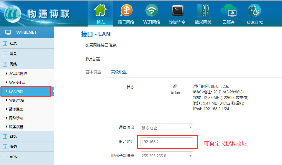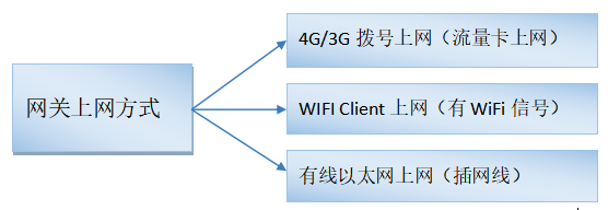 進入網關WEB管理界面(http://192.168.2.1/)設置聯(lián)網方式,可選WIFI網絡、3/4G網絡(需要在網關通電前插入手機SIM卡,默認已開啟3/4G網絡)、WAN外網,三者只能選一個。