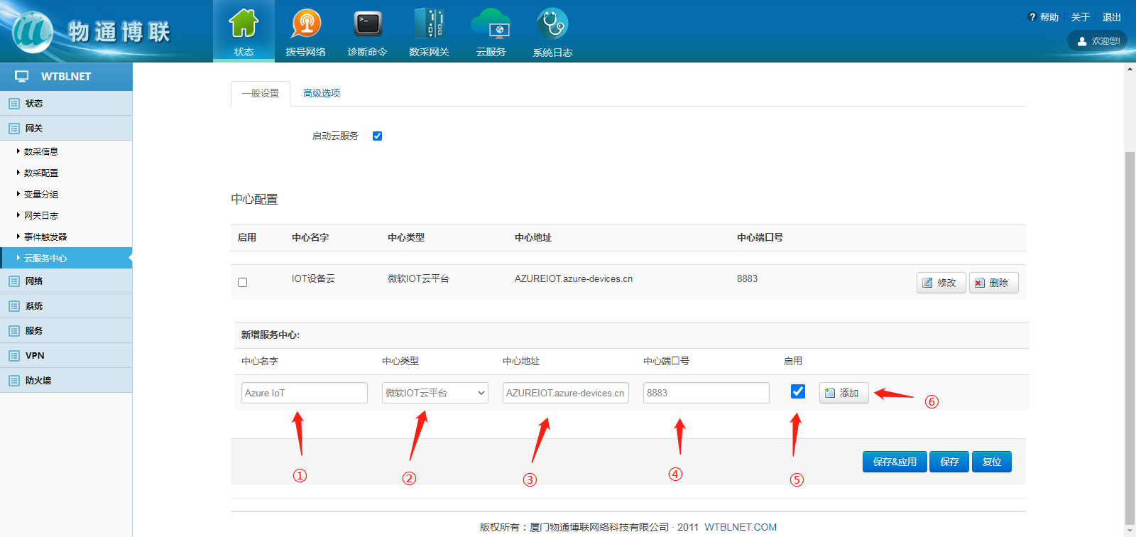 3、打開物通博聯網關WEB界面,新建一個連接中心,中心類型選擇微軟IoT云平臺,輸入相應信息,勾選啟用,點擊“添加” ,填寫對應數據即可實現設備數據上傳到微軟Azure IoT物聯網平臺。
