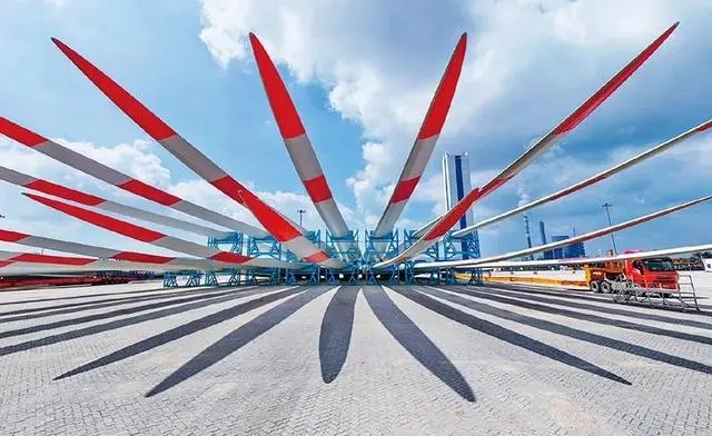 綠色低碳是新型工業(yè)化的生態(tài)底色。近年來,我國穩(wěn)妥有序推進(jìn)工業(yè)綠色低碳轉(zhuǎn)型,積極打造綠色產(chǎn)業(yè)集群,努力讓綠色成為高質(zhì)量發(fā)展的鮮明底色。圖為2023年9月8日,一批風(fēng)電葉片在江蘇省鹽城港射陽港區(qū)碼頭等待運(yùn)輸。 新華社記者 李博/攝