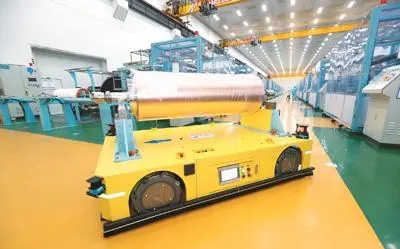 圖為在浙江花園新能源股份有限公司銅箔生箔車間內(nèi),自動導(dǎo)引車(AGV)正在協(xié)助生產(chǎn)車間完成自動取放卷及跨車間轉(zhuǎn)運(yùn)成品等。包康軒攝(人民視覺)