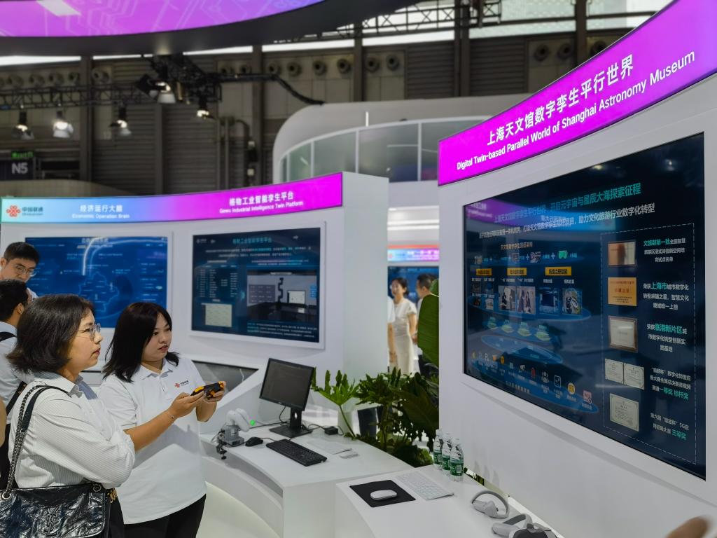 6月26日,觀眾在中國聯通展臺體驗“上海天文館數字孿生平行世界”。新華社記者 陳愛平 攝