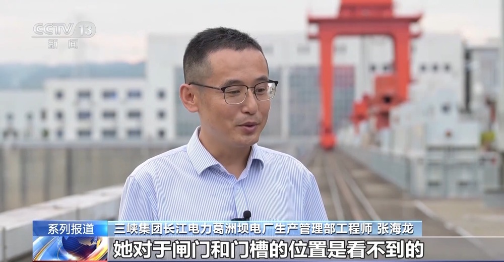 三峽集團長江電力葛洲壩電廠生產管理部工程師 張海龍:司機是在10米以上的高空當中,她對于閘門和門槽的位置是看不到的,所以她依賴于下面的指揮,和其他一些輔助人員來觀看。
