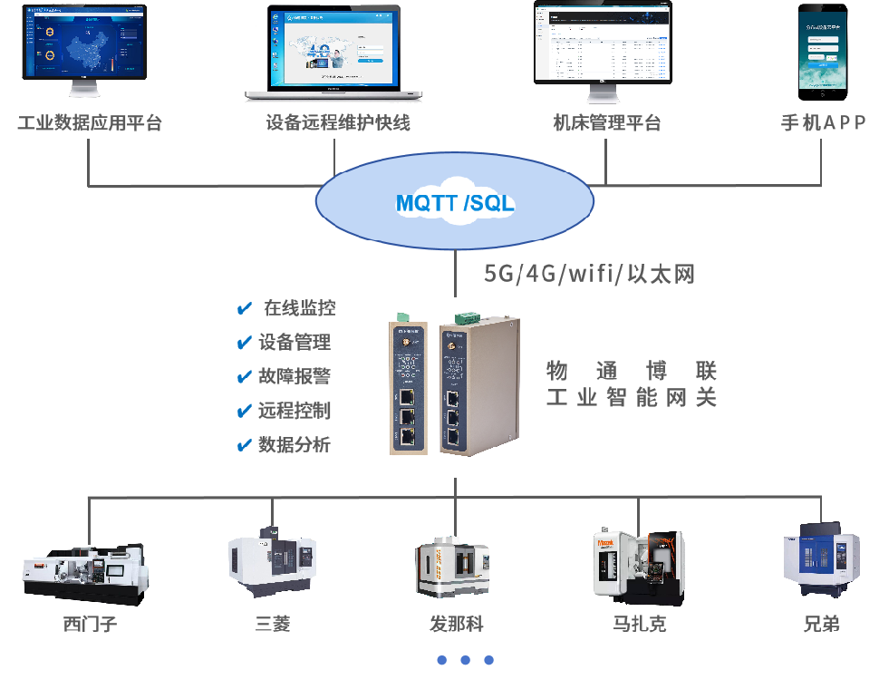實時采集機床運行數(shù)據(jù)(機床狀態(tài)、刀具狀態(tài)、主軸狀態(tài)、轉速等),生產數(shù)據(jù)(班次加工數(shù)量、班次加工時間、總加工數(shù)量、總加工時間等),性能數(shù)據(jù)(時間稼動率、性能稼動率、OEE、良品率等),并通過5G/4G/WIFI/以太網等方式對接到云平臺或上位機中。