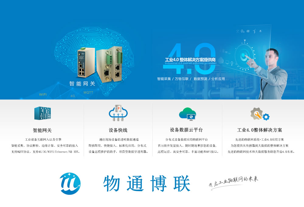 物通博聯是一家工業物聯網產品以及工業4.0解決方案提供商,專注于智能設備、智能工業以及行業(水務、電力、市政、樓宇、農業、油井礦山)等領域提供物聯終端、智能網關、設備快線及應用于平臺等智能化產品及應用方案。