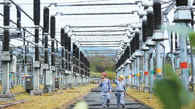 今年夏季,全國用電負荷快速增長,各地電力穩發滿發。圖為8月25日,在四川省達州市,技術人員巡查燃氣發電公司廠區升壓站。 鄧良奎攝(人民視覺)