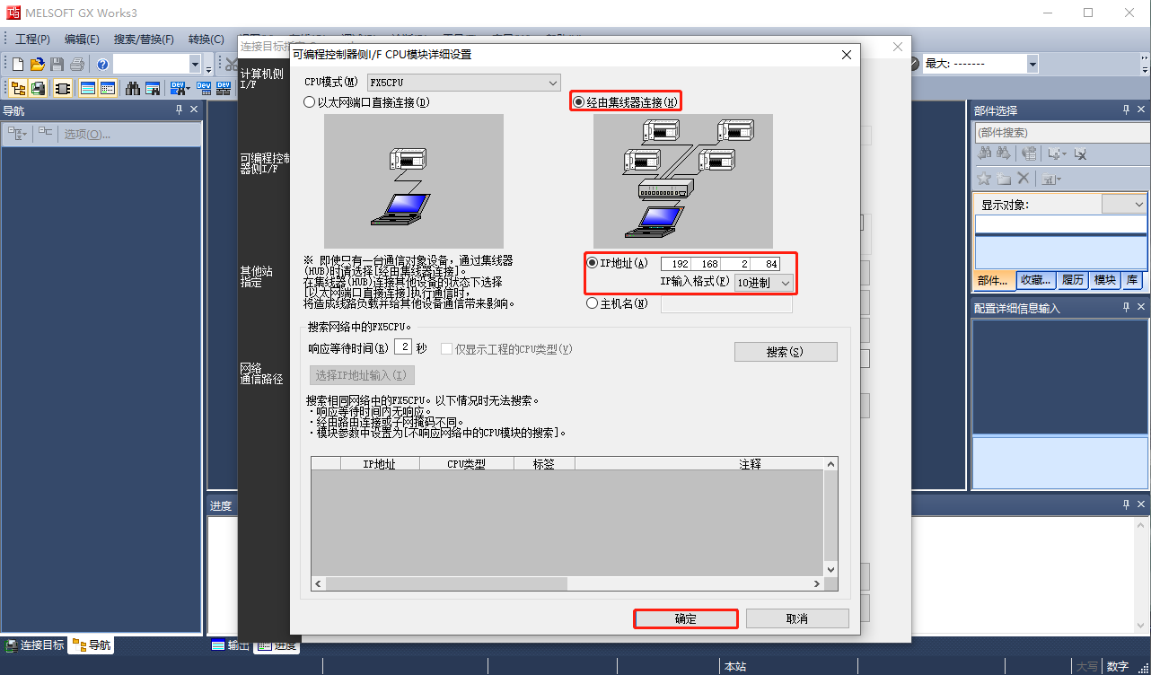 3、“CPU模式”設(shè)置,“經(jīng)由集線器連接”,填寫控制器的IP地址。