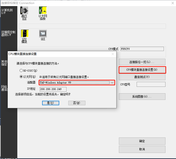 4、 CPU模塊直連連接設(shè)置以太網(wǎng)適配適配器“TAP-Windows Adapter V9”。