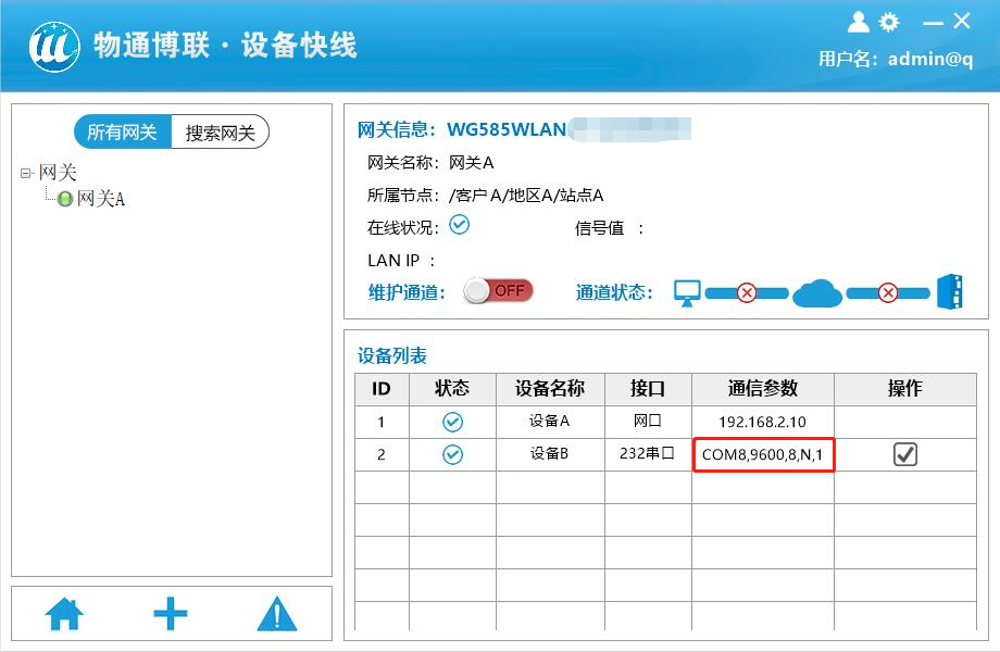 1、啟動(dòng) “設(shè)備快線客戶端軟件”軟件,通過官方提供的賬號密碼登錄。選擇在線網(wǎng)關(guān),不用打開維護(hù)通道,勾選設(shè)備列表的設(shè)備等待彈出串口透傳通道建立成功,點(diǎn)擊確認(rèn),遠(yuǎn)程維護(hù)完畢后需關(guān)閉通道。