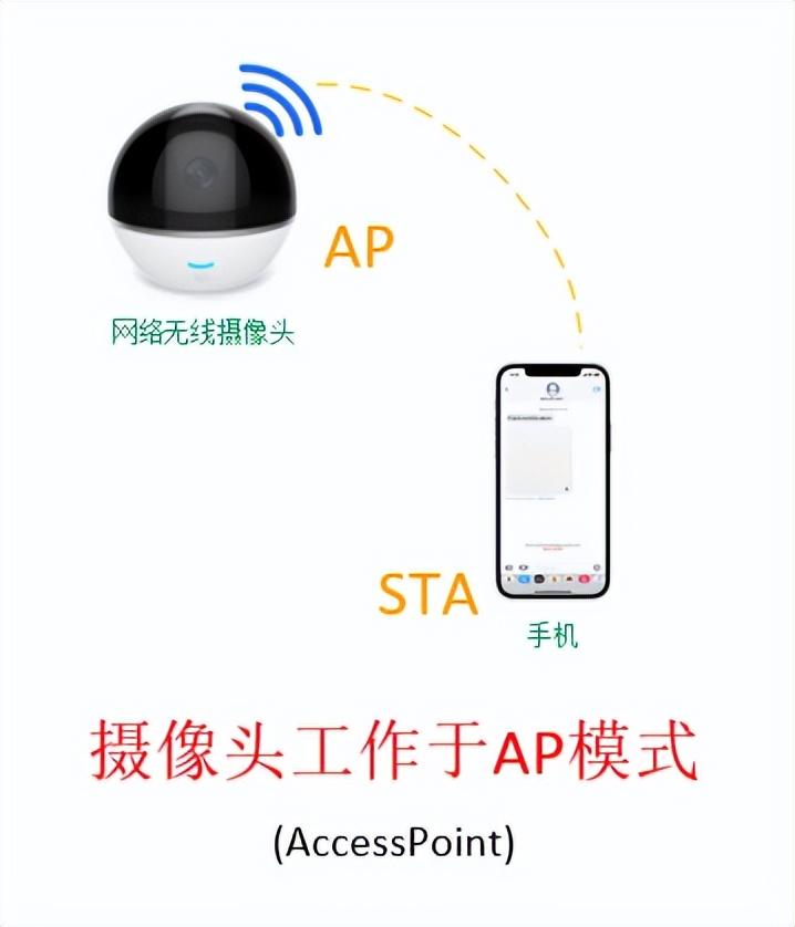 不過,這些 “其它設(shè)備” 不是始終工作在STA模式的,比如無線攝像頭,在剛買回來進(jìn)行Wi-Fi配網(wǎng)時(shí),它的Wi-Fi就會(huì)先工作于AP模式,即這個(gè)攝像頭是一個(gè)無線熱點(diǎn),如下圖,我們的手機(jī)可以連接到這個(gè)熱點(diǎn),可以給它發(fā)送家里的路由器的Wi-Fi名稱與密碼,這樣攝像頭就能實(shí)現(xiàn)聯(lián)網(wǎng)了,即實(shí)現(xiàn)了設(shè)備的Wi-Fi配網(wǎng)。當(dāng)然,這只是其中一種配網(wǎng)方式,還有許多其它方式可以實(shí)現(xiàn)物聯(lián)網(wǎng)設(shè)備的Wi-Fi配網(wǎng)。