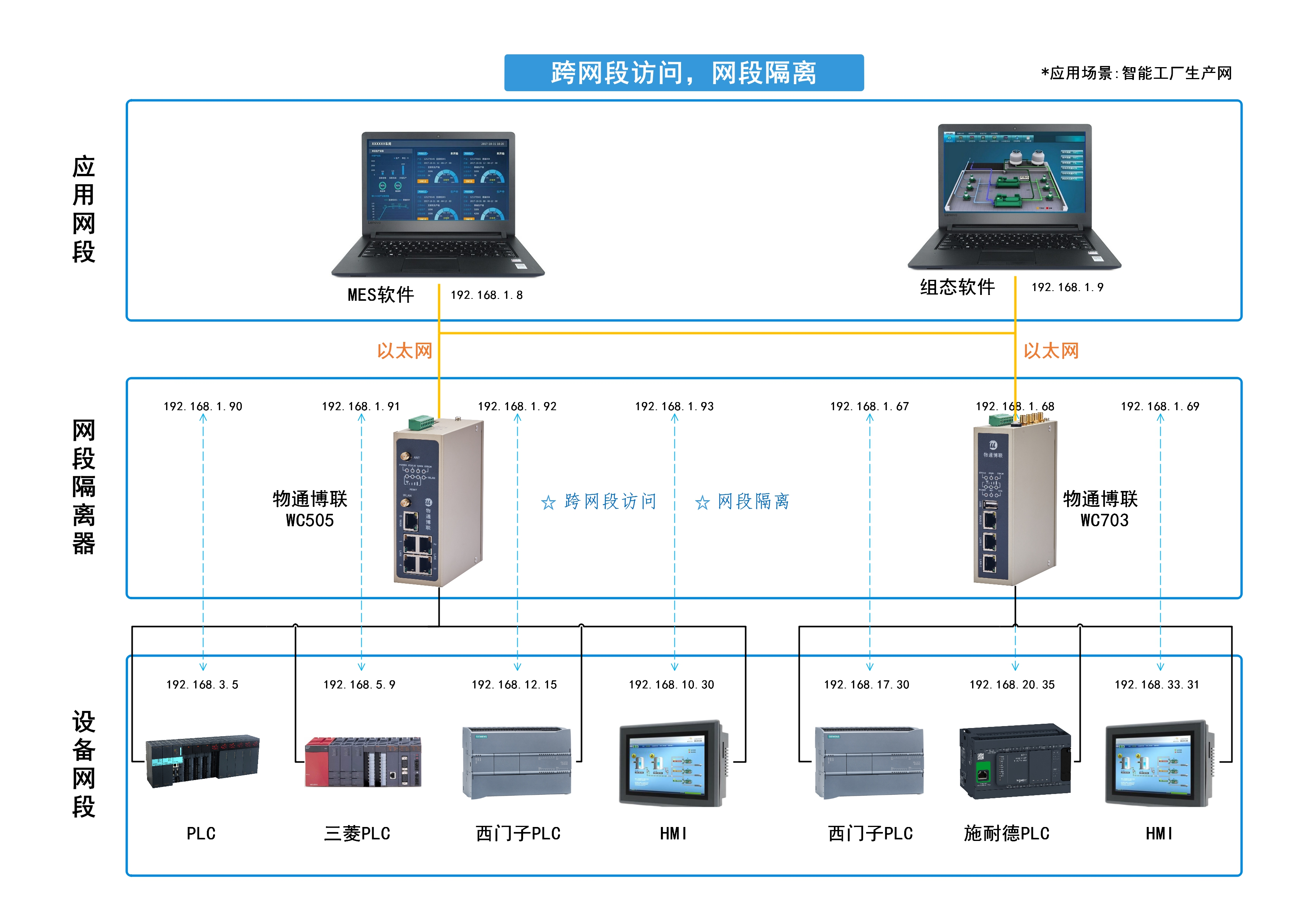 WC703網段隔離器(NAT轉換網關)適用于生產網絡對 PLC、HMI、CNC、DCS、MES等網絡通訊和數據采集,兼有跨網段隔離和IP轉換的功能。同時支持2臺以上設備(如PLC、CNC等)網段隔離和NAT 轉換;車間多個設備,如果有不同網段的IP地址,則可以統一成同一網段的IP地址,進行設備(PLC、CNC)的在線編程、數據采集、遠程管理等各種跨網段訪問。