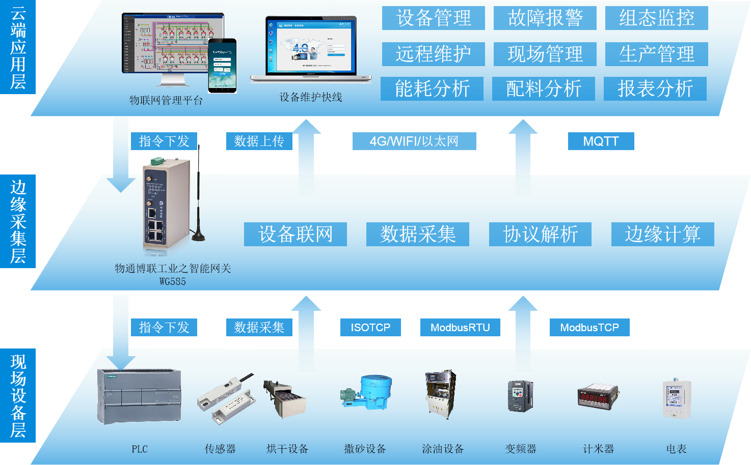 工廠現場具有PLC、溫度傳感器、壓力傳感器、烘干機、涂油機、撒沙設備、電表、計米器等設備,通過串口、網口等設備接口將現場設備連接到物通博聯工業智能網關WG585,網關采集現場設備數據后通過4G/WIFI/以太網等網絡方式將數據通過MQTT協議實時上傳到物聯網管理平臺進行分析、處理,管理者通過電腦和手機就能遠程查看現場設備運行參數、設備狀態、工藝組態、生產情況、物料消耗以及故障記錄等,實現設備管理、現場管理、生產管理、遠程維護、能耗分析、配料分析、數據分析應用等功能,實現產品生命周期和備品備件管理,保障高效率的生產。