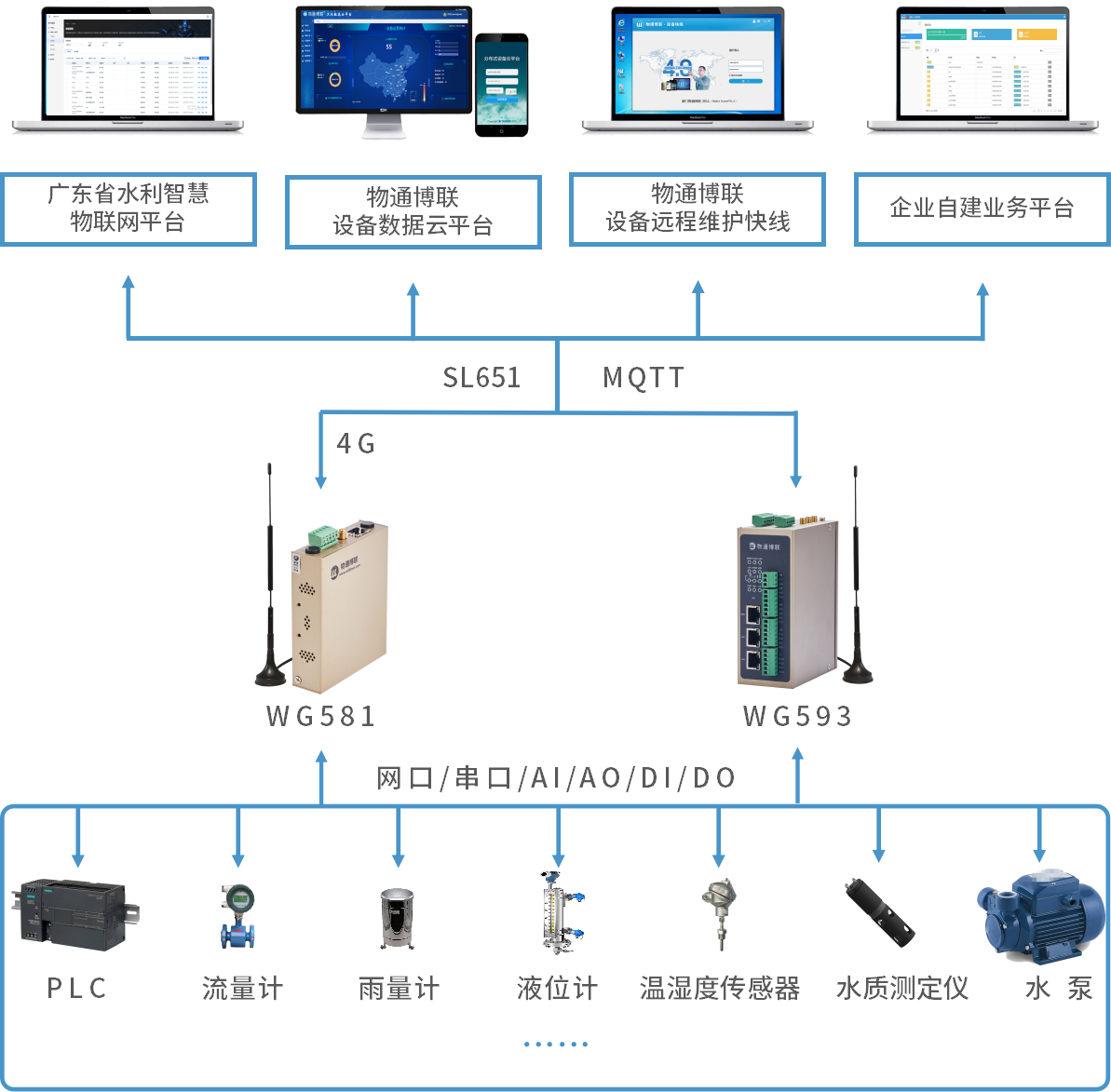 通過物通博聯工業智能網關采集PLC、流量計、溫濕度傳感器、雨量計、液位計等等相關設備數據,將流量、流速、水位、水深、溫度、濕度、水壓等等數據通過邊緣計算、數據標準化后以4G/WIFI等網絡方式通過MQTT/SL651等協議傳輸到廣東省水利智慧物聯網平臺或者企業自建業務平臺。