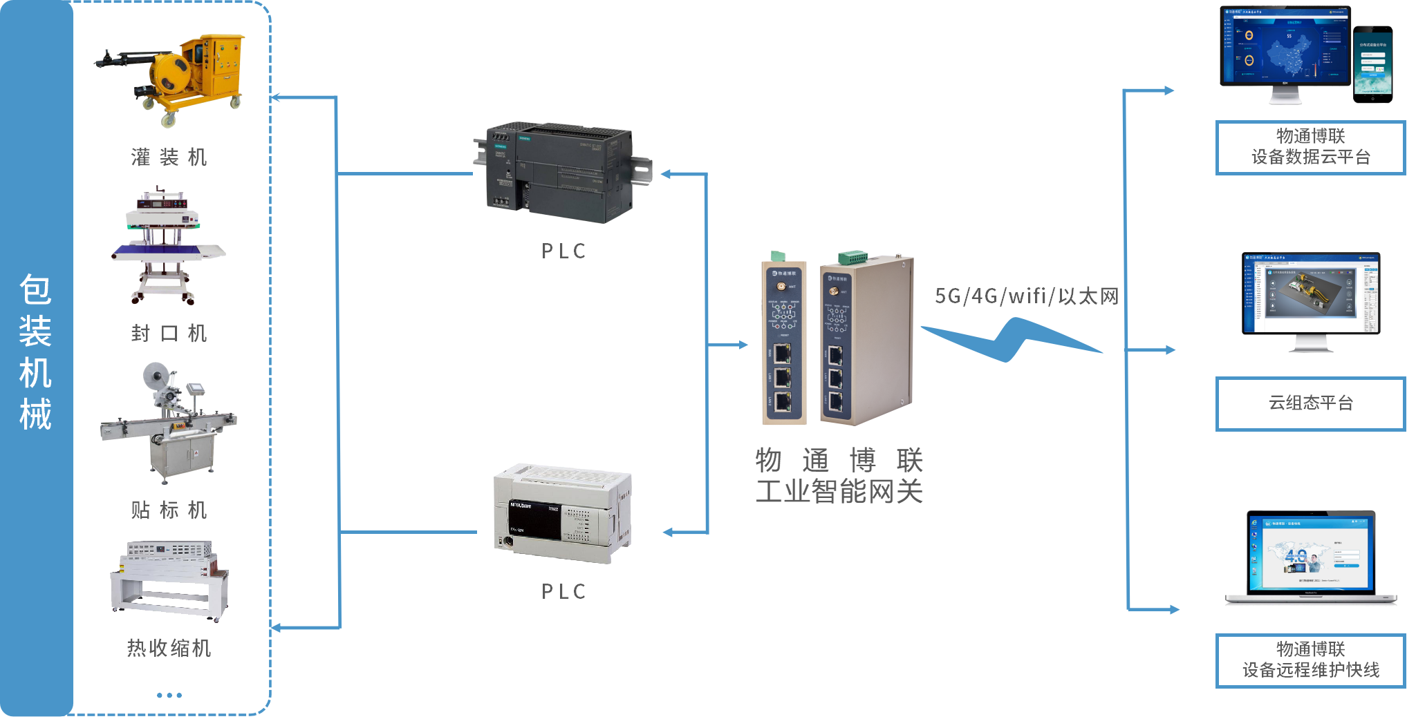 物通博聯工業智能網關具有豐富的通信協議和接口,通過接入包裝機械設備的控制器PLC,就能實時采集包裝機械設備運行狀態、溫度、壓力、振動等參數,通過5G、4G、WIFI、以太網等方式將數據上傳到云平臺,實現遠程監控、組態監控、設備管理、故障報警、遠程控制、遠程維護、數據分析等功能,全面掌握設備的運行情況,幫助企業提升包裝機械設備運維與管理水平,保障安全穩定生產,提高生產效率。