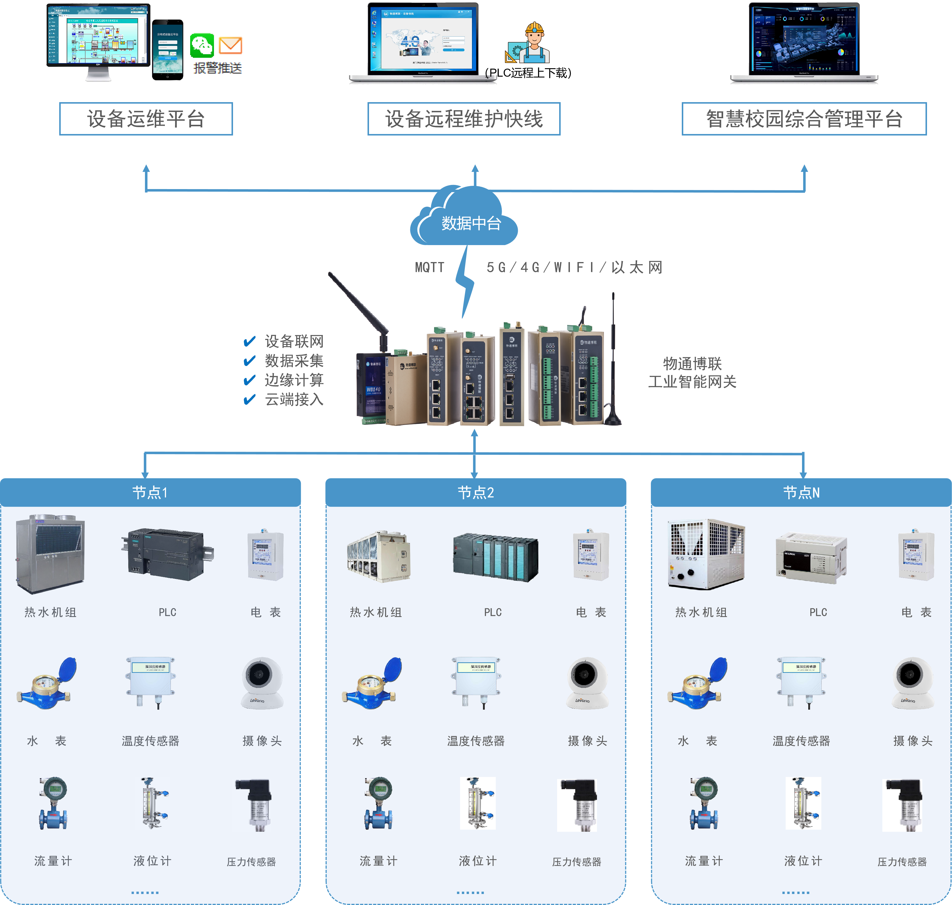 現場控制器PLC匯集溫度傳感器、液位傳感器、溢流開關、電磁閥、水表、空氣能設備、電表、變頻器、水泵、繼電器等設備,對這些設備進行邏輯控制,物通博聯工業智能網關通過以太網/串口方式從現場設備采集設備的各項數據(設備運行狀態、溫度、液位、出水壓力、耗電量、制熱量)等信息,利用邊緣計算能力對數據進行處理從而完成數據標準化,然后通過4G網絡把數據上傳物通博聯數據中臺,物通博聯數據中臺將數據轉發到設備遠程監控管理系統,實時監控熱水機站狀態,支持對熱水機組進行遠程控制,實現不同時段、不同天氣溫合理調節機站運行狀態、設置溫度,支持故障報警,告警異常及時通知到運維人員,提前發現及時處理,提升服務質量,預防事故發生,降低運營成本,達到節能減排目的;同時物通博聯數據中臺將數據接入到智慧校園綜合管理平臺和校園一卡通系統,方便學生和教職工使用,提高學校管理效率。