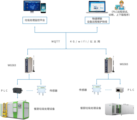 物通博聯(lián)工業(yè)智能網關WG583與餐廚垃圾處理設備進行通訊,可以將設備的運行狀態(tài)、工作參數(shù)等數(shù)據采集到網關上,進行解析并上報到云端。