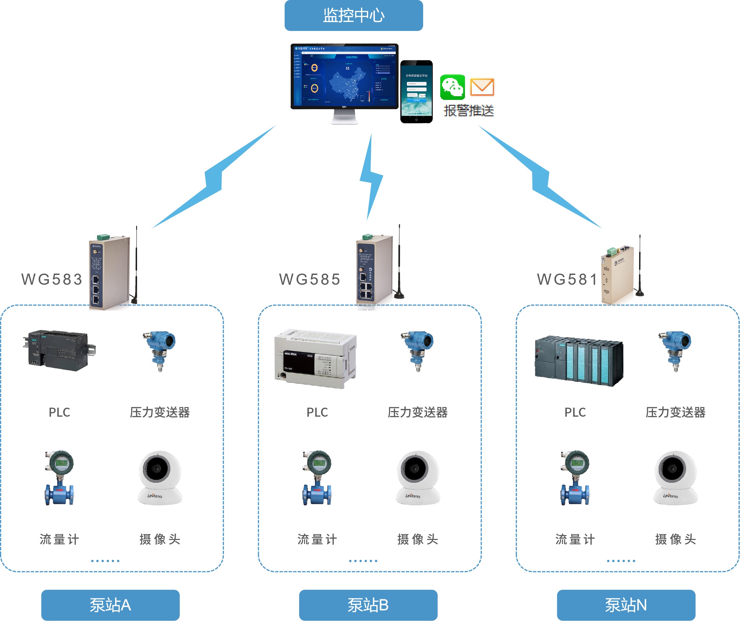 通過設定警戒值能夠實現自動告警上報,如水壓超限告警、水泵工作狀態變化、電流電壓超限等情況,從而在微信、短信、郵件等方式接收到告警信息,快速定位采取措施。