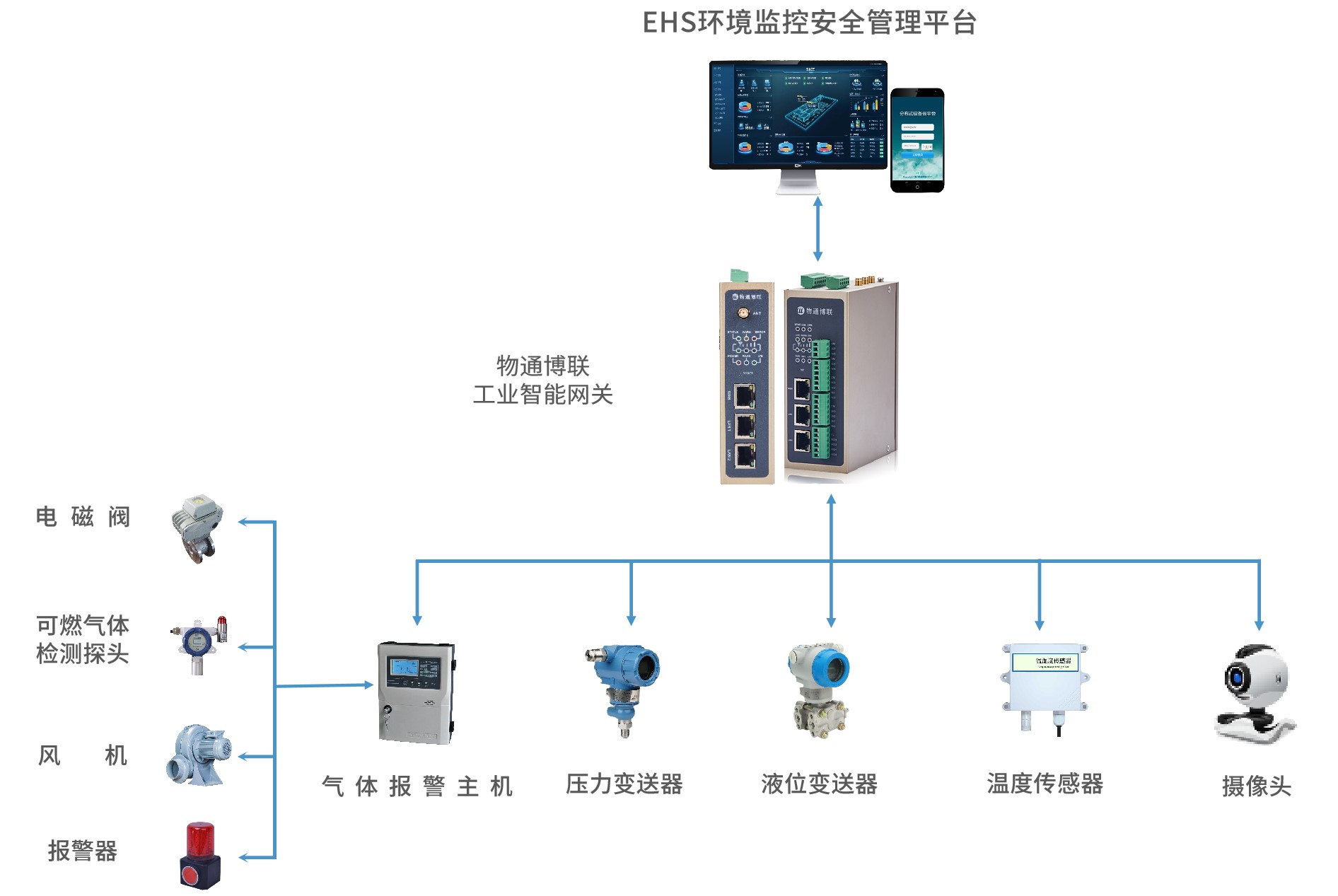 現(xiàn)場可燃?xì)怏w探測主機(jī)為RS485串口,通過接入物通博聯(lián)工業(yè)智能網(wǎng)關(guān),能夠?qū)崟r采集液位、壓力、溫度等數(shù)據(jù),并通過工廠局域網(wǎng)對接到EHS環(huán)境監(jiān)控安全管理平臺中,從而實現(xiàn)車間各點位環(huán)境參數(shù)的實時監(jiān)控、超限告警、在線管理等,及時采取措施管理控制,保證車間環(huán)境安全,避免出現(xiàn)意外事故與經(jīng)濟(jì)損失。