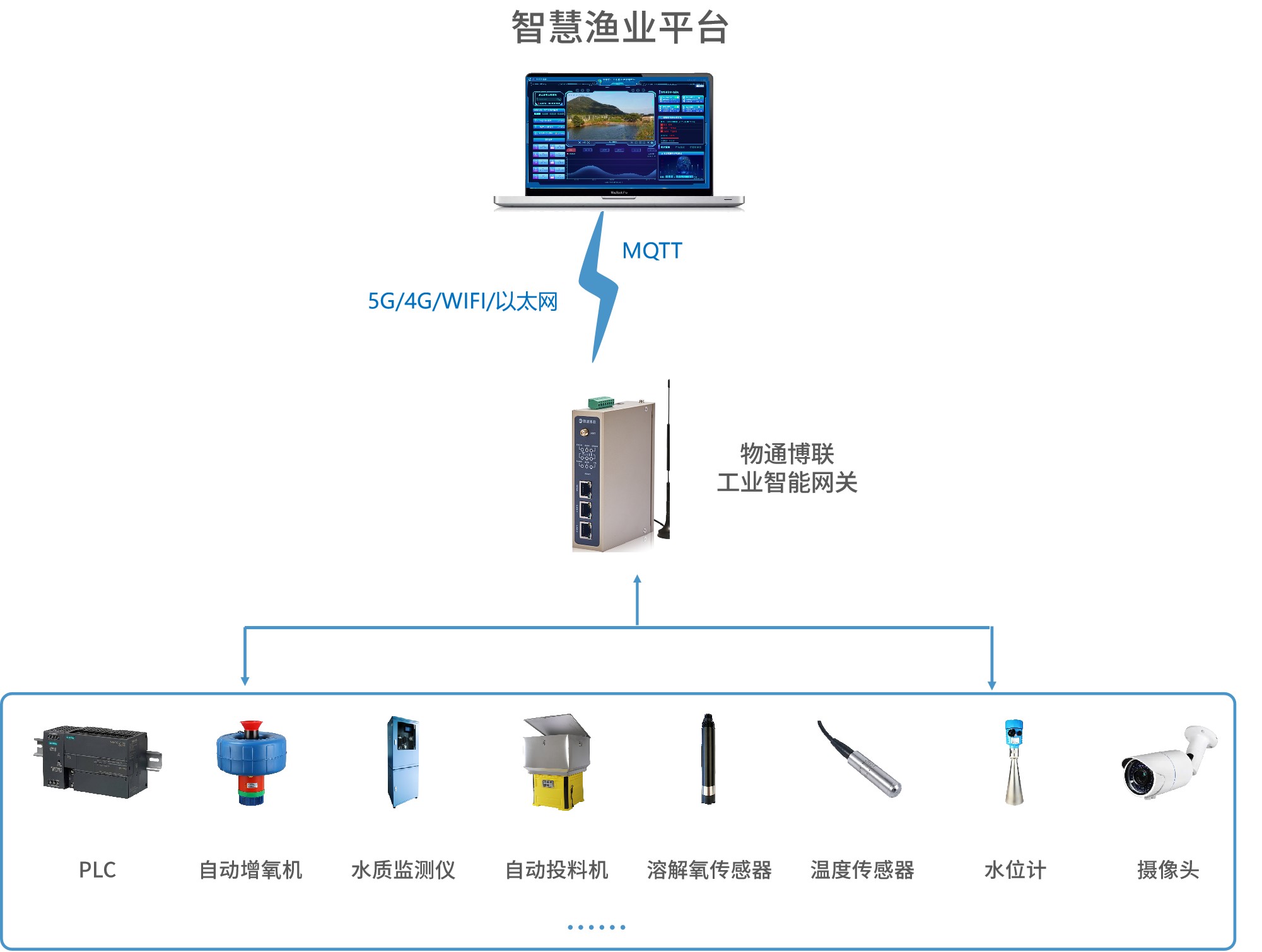 實時采集溫度傳感器、水質監測儀、PLC、攝像頭等設備并對接到智慧漁業云平臺或現場監控大屏中,確保數據采集通信的安全性與完整性。