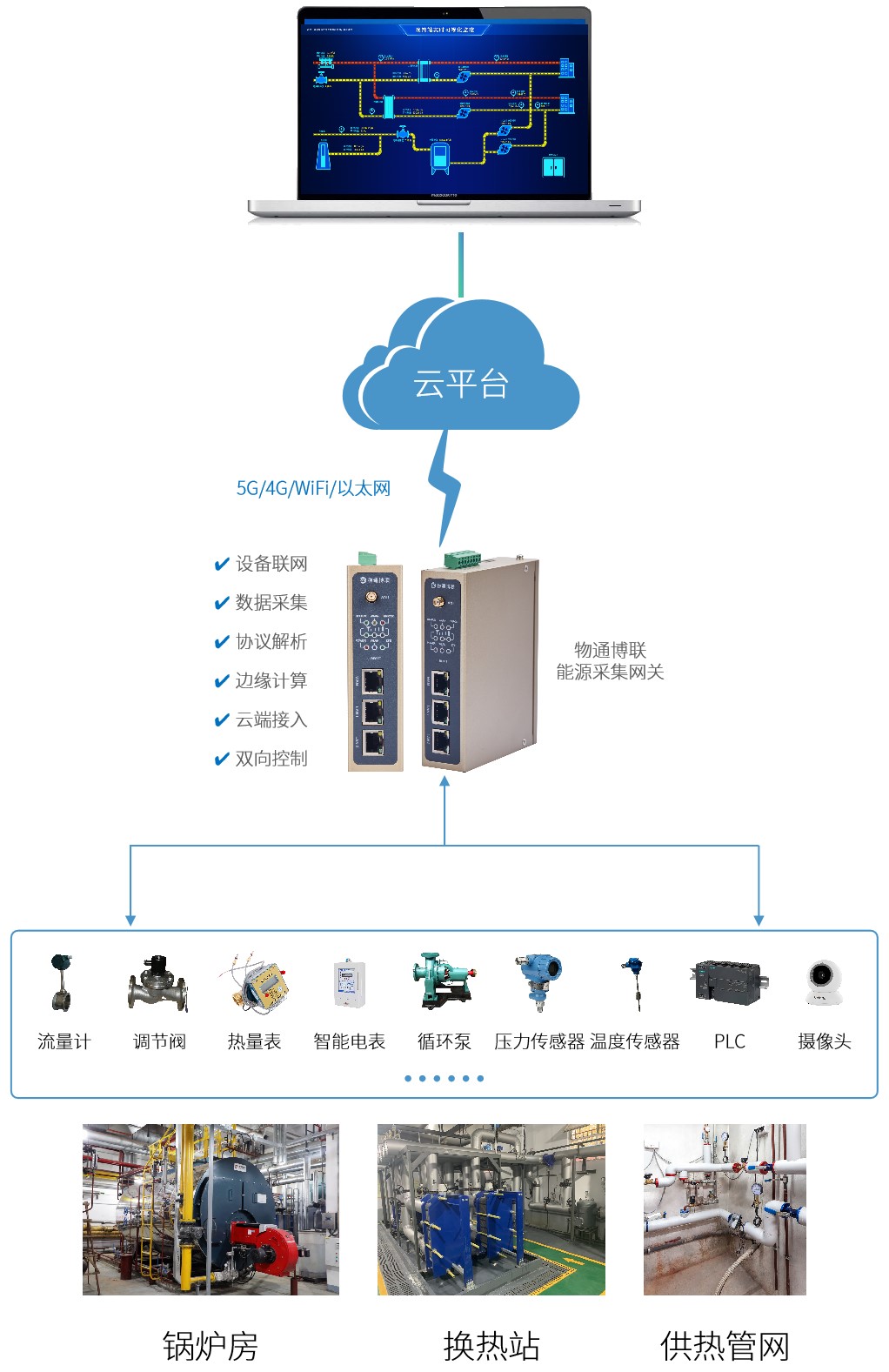 網(wǎng)關(guān)具備多個串口/網(wǎng)口的數(shù)據(jù)采集能力,能夠接入多個流量計、智能電表、熱量表、稱重儀器等設(shè)備,實時采集各類能耗數(shù)據(jù)并通過5G/4G/WIFI/以太網(wǎng)等方式對接到管理平臺中。